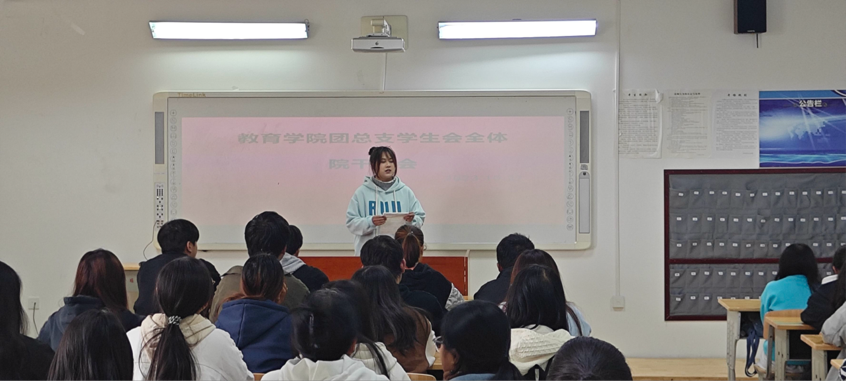 为进一步加强教育学院团学工作队伍建设,10月27日上午,教育学院团总支学生会在特教大楼B0909召开2023年第二次全体大会。会议由教育学院团总支书记孙野主持,教育学院团总支学生会全体团学干部参加会议。