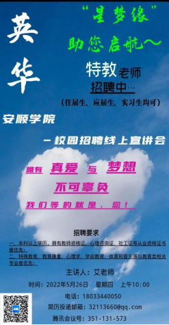 2022年5月26日(星期四)上午10点开始,教育学院开展深圳市英华教育投资发展有限公司专场招聘会。本次招聘会按照疫情防控要求,以线上方式开展。