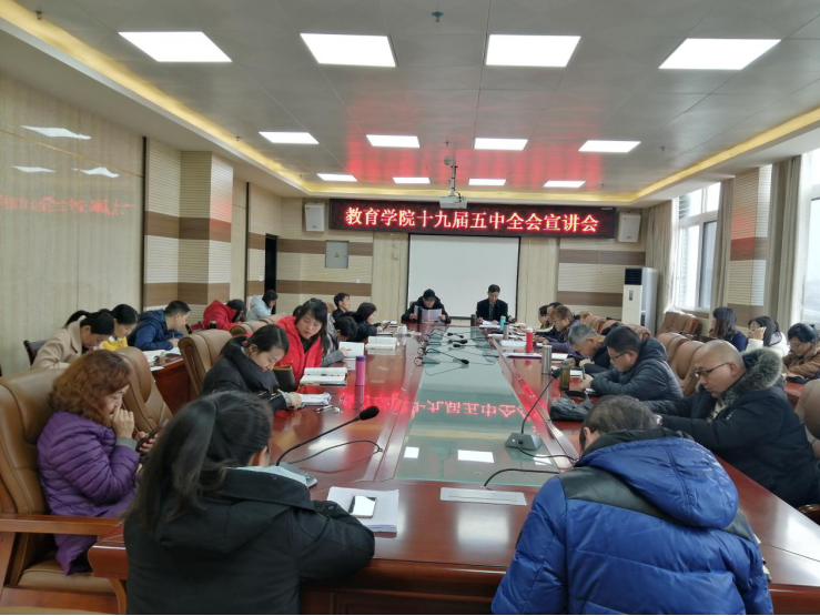为学习贯彻党的十九届五中全会精神,努力实现教育高质量发展,2020年11月30日,教育学院在特教大楼会议室举行十九届五中全会精神宣讲会。由教育学院党委书记徐忠同志进行宣讲,教育学院全体教师参加。