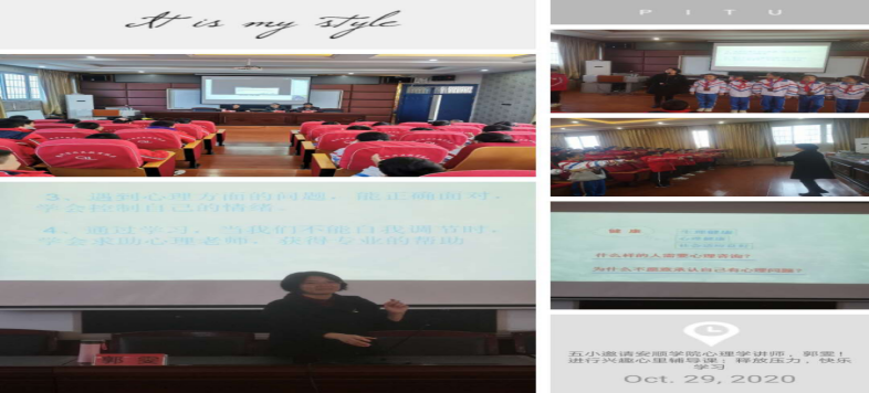 10月29日,教科院学生支部书记郭雯老师走进安顺市第五小学,为小学高年级同学开展“释放压力、快乐学习”的心理健康讲座。