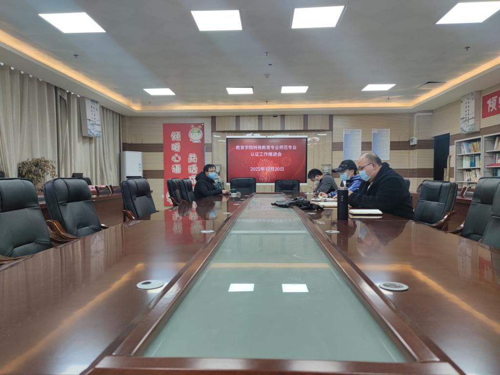 2022年12月21日上午,教育学院召开特殊教育专业师范专业认证工作推进会,会议在特教大楼7楼会议室进行。会议由邱天龙院长主持,特殊教育教研室全体教师线上、线下一同参加会议。