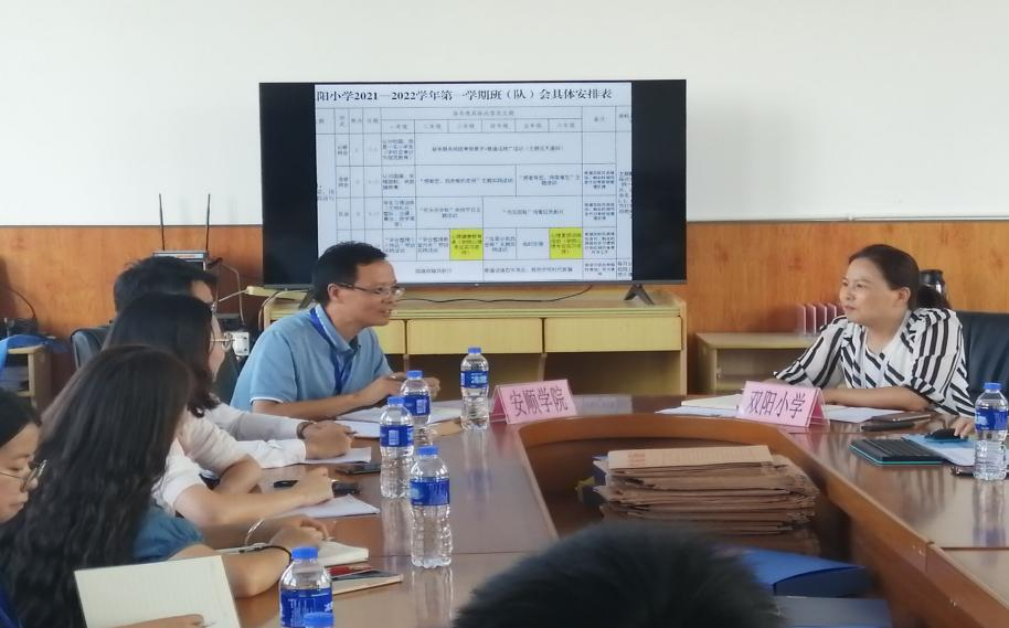 双阳小学汪先娥老师首先简要介绍了双阳小学心理健康工作的开展情况,随后双方就开展的具体内容和形式进行交流并达成共识。教育学院院长邱天龙教授对我院本学期前往双阳小学进行教育实习的应用心理学专业学生提出了具体要求,双阳小学副校长焦俊希望此次到校实习的心理学专业学生能够结合实际情况,有针对性的开展相关教学实习工作。