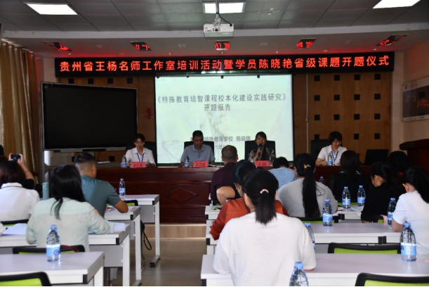 为充分发挥名师工作室的示范引领作用,促进遵义市特殊教育内涵发展,2021年9月24日,贵州省特殊教育王杨名师工作室在务川县特殊教育学校开展工作室学员陈晓艳副校长的省级课题开题仪式暨课题研究培训。本次活动,特别邀请我院刘其晴教授对陈晓艳副校长的省级课题进行指导,王杨名师工作室成员与学员、课题组成员、务川县特殊教育学校教师共70余人参加了开题仪式和课题研究培训。