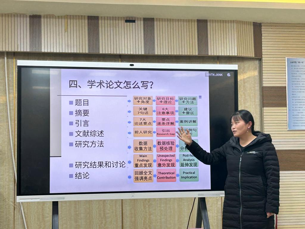 在本次沙龙中,杨集梅博士以其丰富的科研经验和独到的学术见解,为老师们带来了一场精彩的分享。她首先强调了学术论文撰写的重要性,指出学术论文是科研成果的重要载体,也是学术交流的主要方式之一。随后,杨博士从论文选题、文献综述、实验设计、数据收集与分析、论文撰写与修改等多个方面,详细阐述了学术论文撰写的全过程。